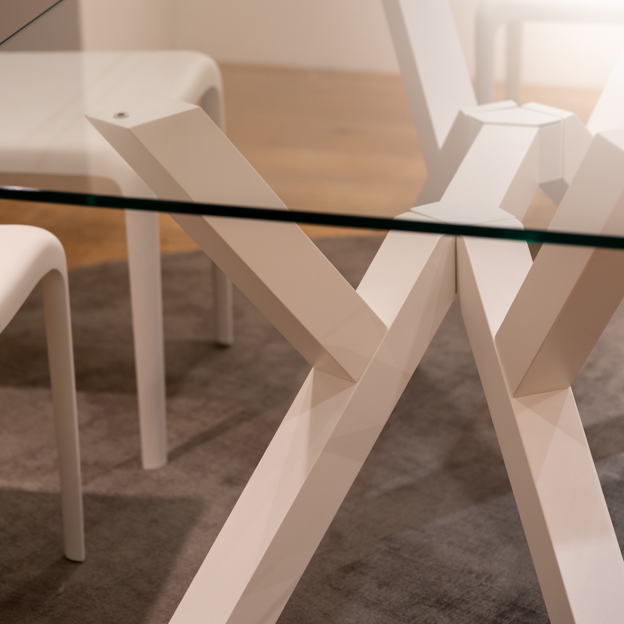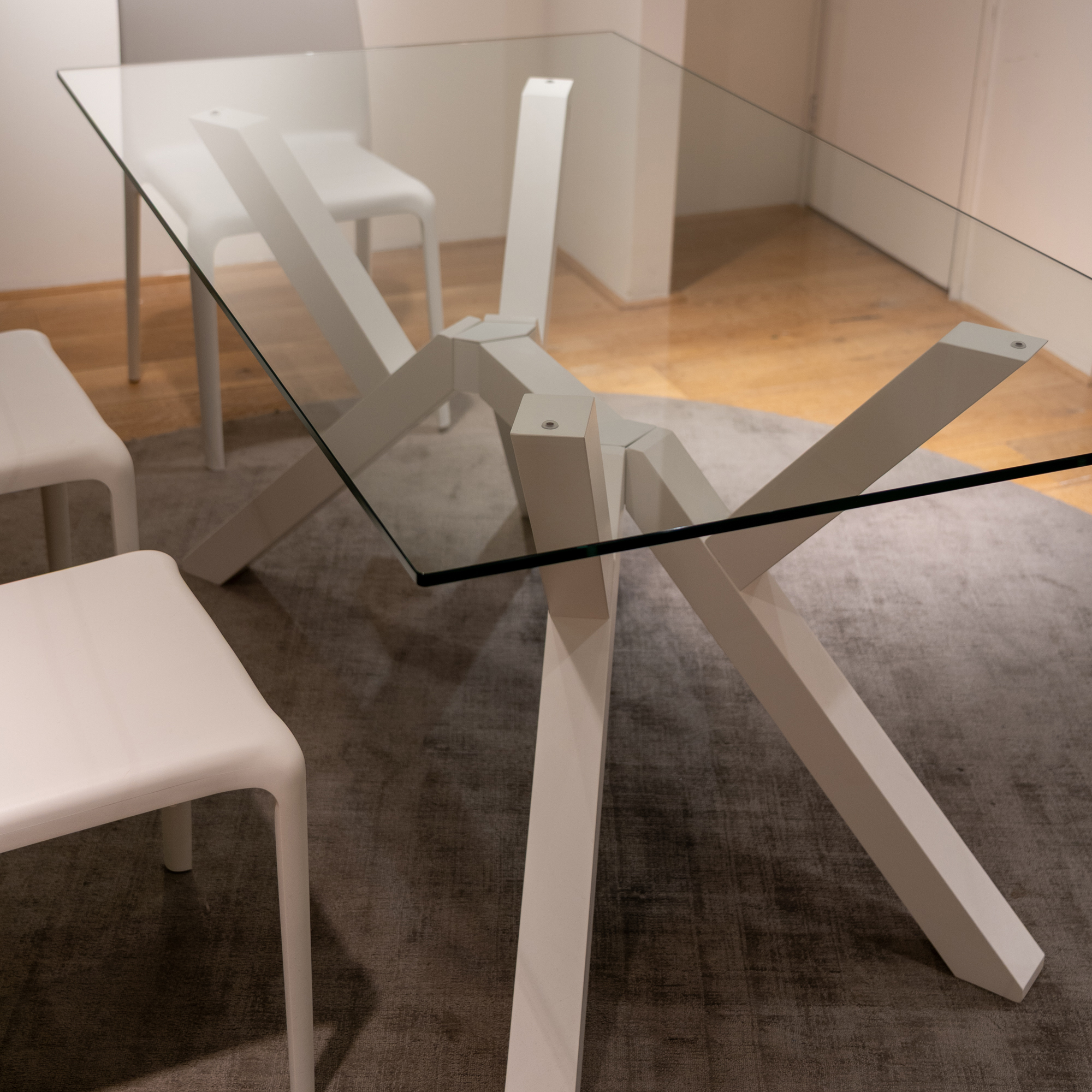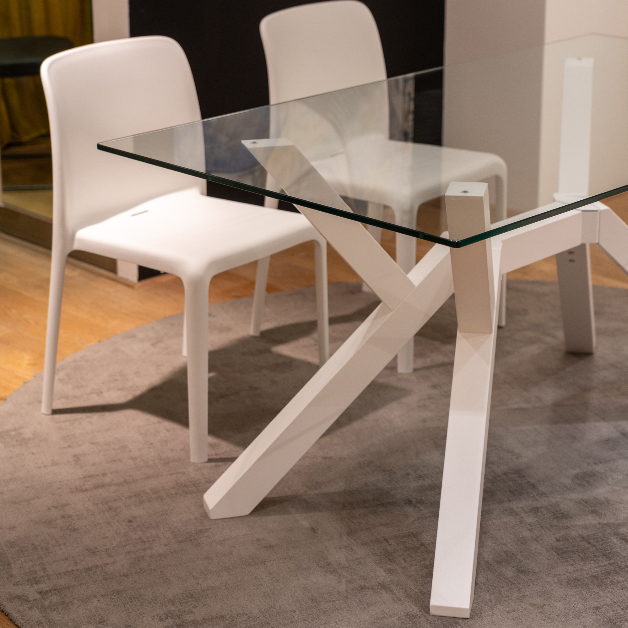 MIKADO is fixed rectangular table with a tempered glass top and beech wood frame and legs.